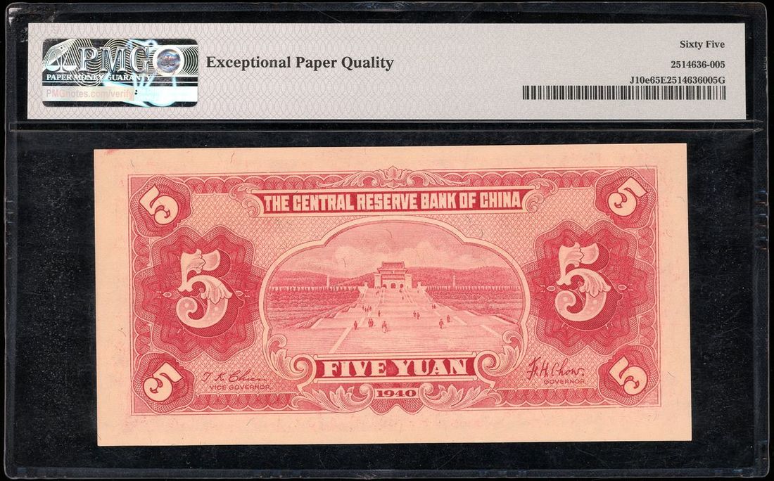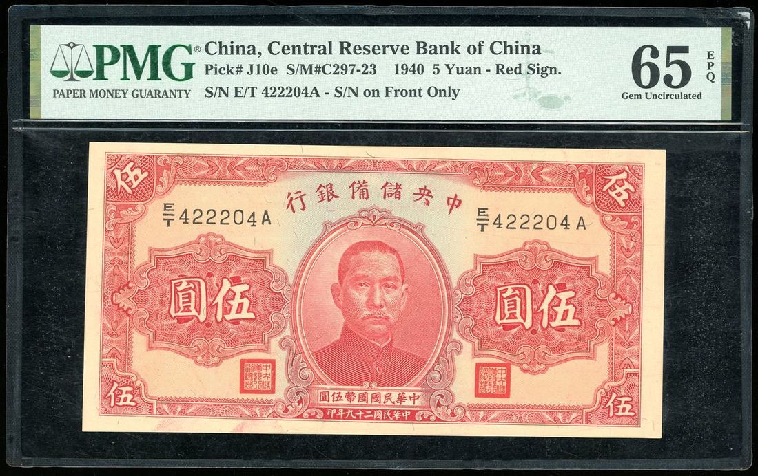 Central Reserve Bank of China, 5 yuan, Year 29 (1940), serial number E/T 422204 A, (Pick J10e), PMG 65EPQ Gem Uncirculated