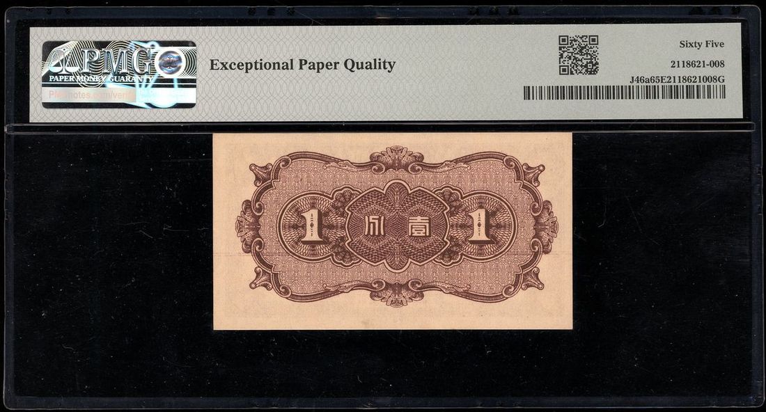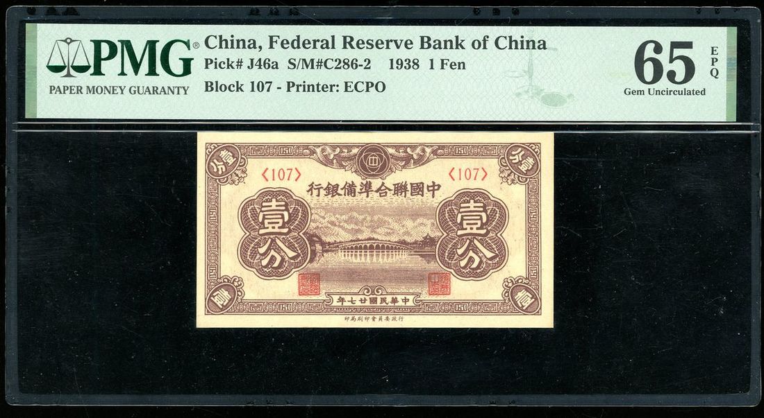 Federal Reserve Bank of China, 1 fen, Year 27 (1938), block number 107, (Pick J46a), PMG 65EPQ Gem Uncirculated