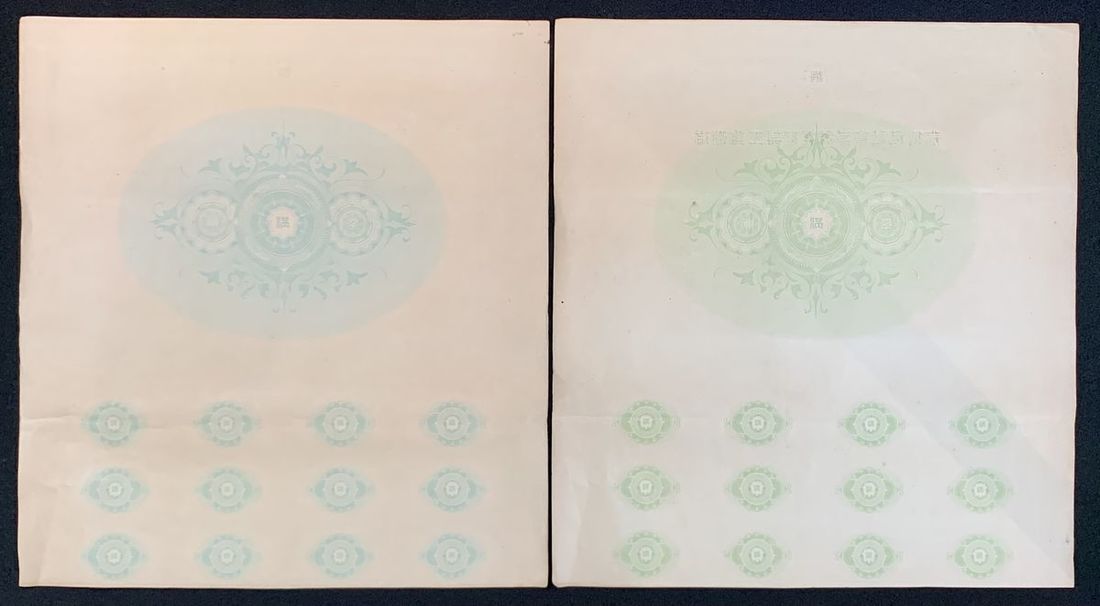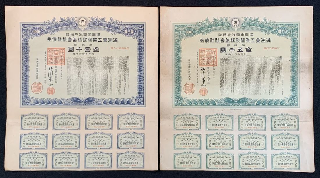 Manchukuo, Heavy Industry Developing Co. Ltd., China, bonds for 1000 and 5000 yuan, Year 6 of Kangde(1939), number 1289 and 504, blue and green ornate border respectively,