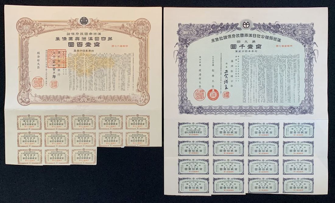 Manchukuo, China, a pair of 100 and 1000 yuan bonds, Year 7 and 8 of Kangde(1940 and 1941), number 167 and 117, brown and black ornate border respectively,