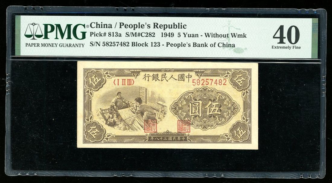 1949年中國人民銀行第一版人民幣5元「紡織」,編號 I II III 58257482,PMG 40