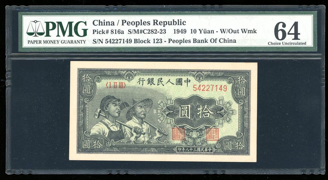 People's Bank of China, 10 yuan, 1949, 1st series renminbi, serial number I II III 54227149, (Pick 816a), nice condition, PMG 64, choice uncirculated.