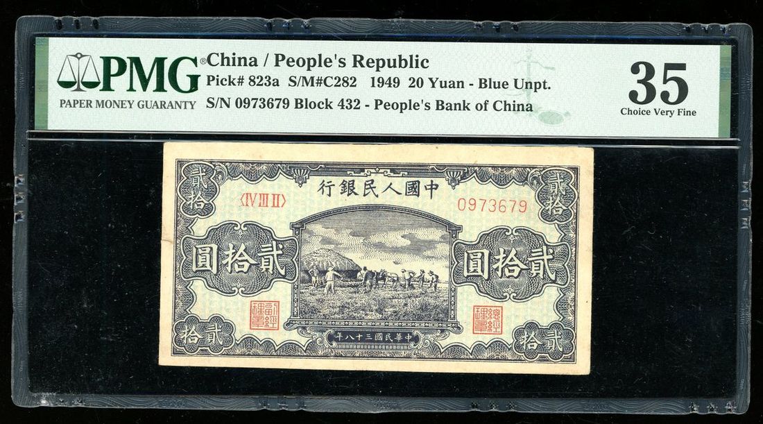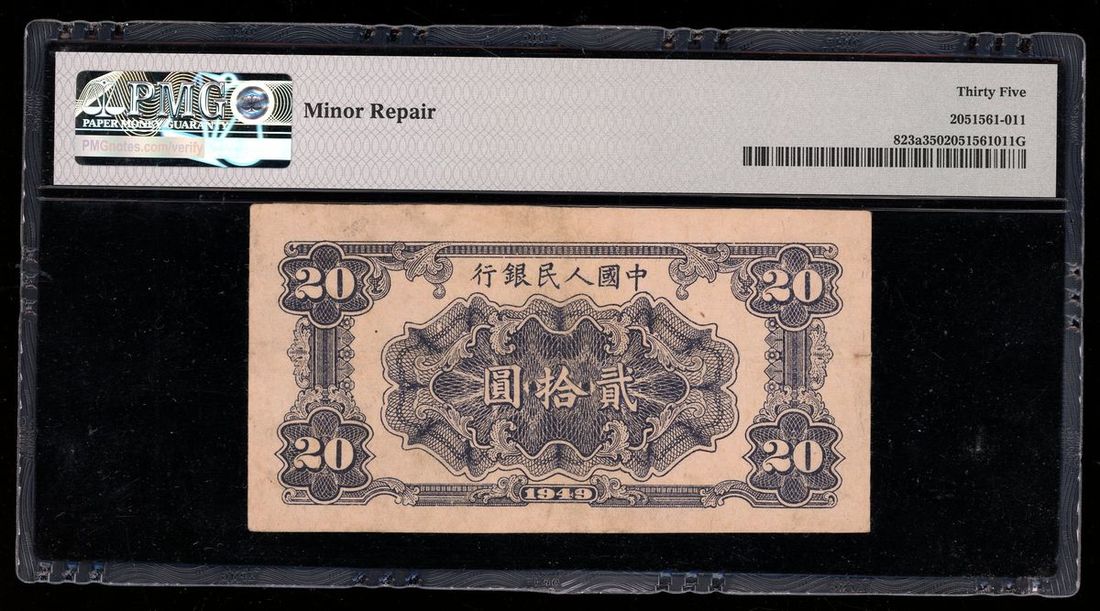 1949年中國人民銀行第一版人民幣20元,編號 IV III II 0973679,PMG 35,輕微修補