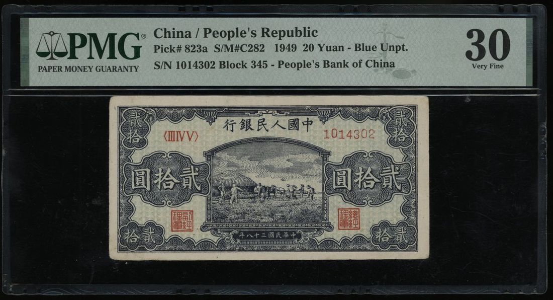 1949年中國人民銀行第一版人民幣20元「打場」,編號III V IV 1014302,PMG 30