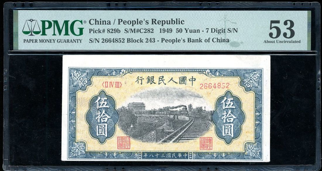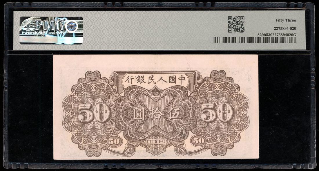 1949年中國人民銀行第一版人民幣50元,編號 II VI III 26648529,PMG 53,雙面打印有下移,PMG未標註錯體