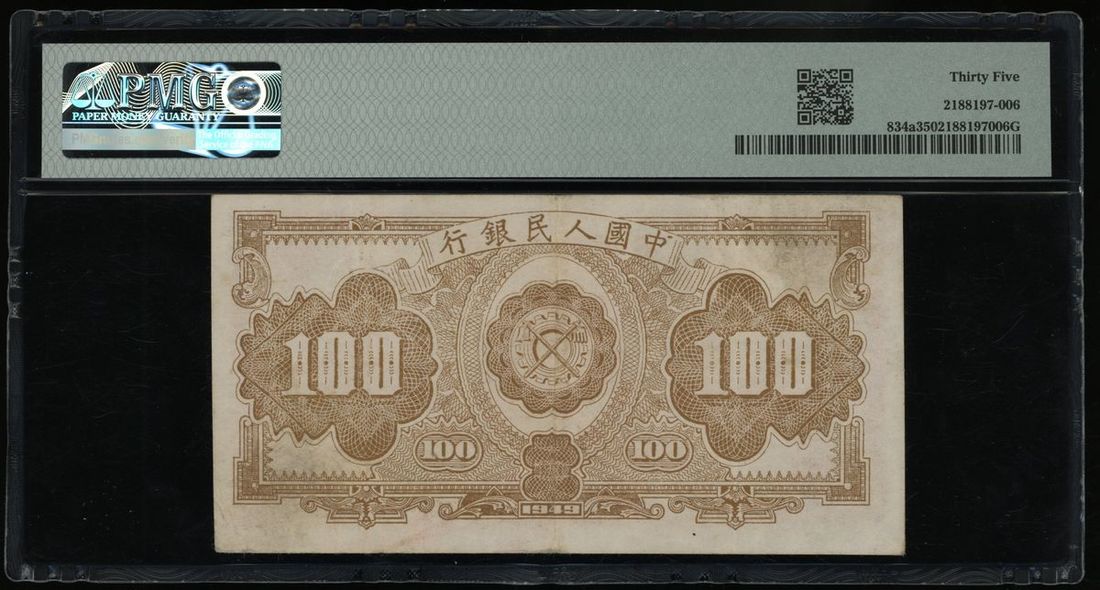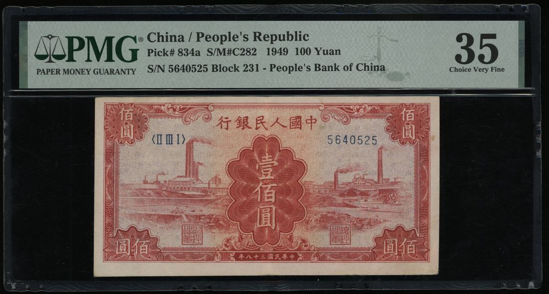 1949年中國人民銀行第一版人民幣壹百圓「紅工廠」,編號 II III I 5640525 ,PMG 35