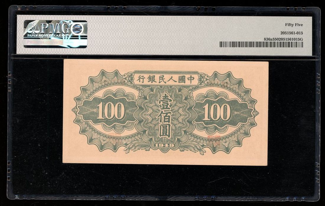 1949年中國人民銀行第一版人民幣壹佰圓,編號 II I III 0129944,PMG 55