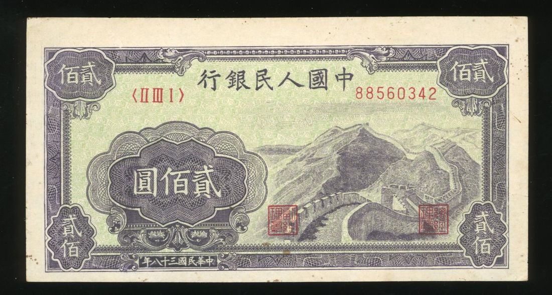 People's Bank of China, 1st Series Renminbi, 1949, 200 yuan, serial number II III I 88560342, 'Great Wall',