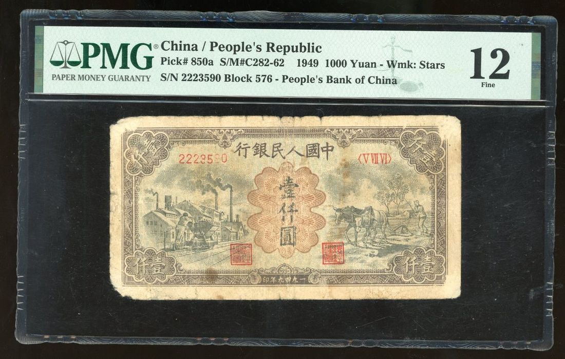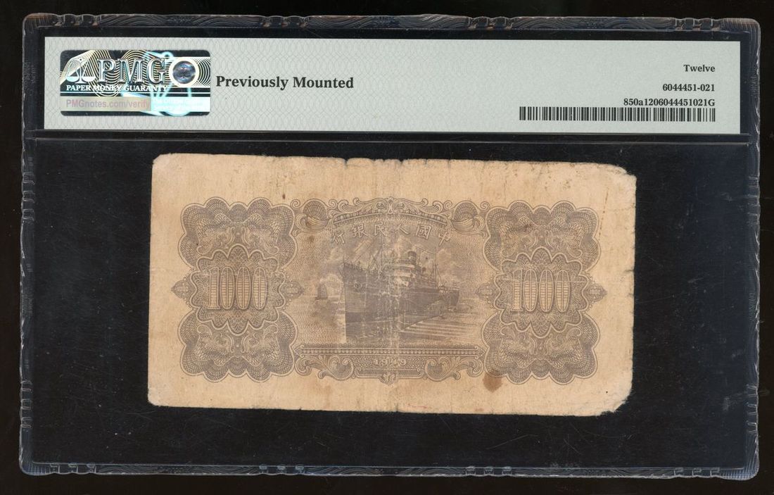 1949年中國人民銀行第一版人民幣1000元「驢子與礦車」,編號V VII VI 2223590,PMG 12