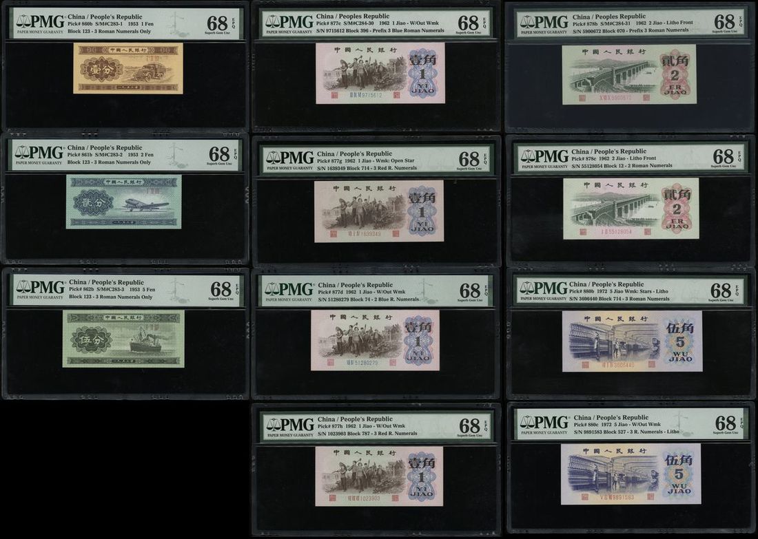 People's Bank of China, a group of 11x fractionals from the 2nd and 3rd Series Renminbi, including: 1 fen, 1953; 2 fen, 1953; 5 fen, 1953; 1 jiao, 1962, without watermark, prefix with 3 blue Roman numerals; 1 jiao, 1962, star watermark, prefix with 3 red Roman numerals; 1 jiao, 1962, without watermark, prefix with 2 blue Roman numerals; 1 jiao, 1962, without watermark, prefix with 3 red Roman numerals; 2 jiao, 1962, prefix with 3 Roman numerals; 2 jiao, 1962, prefix with 2 Roman numerals; 5 jiao, 1972, star watermark; 5 jiao, 1972, without watermark;