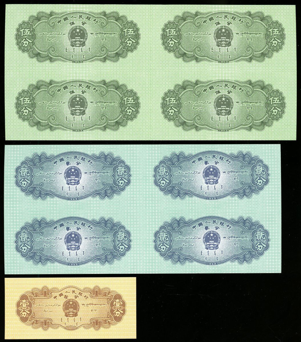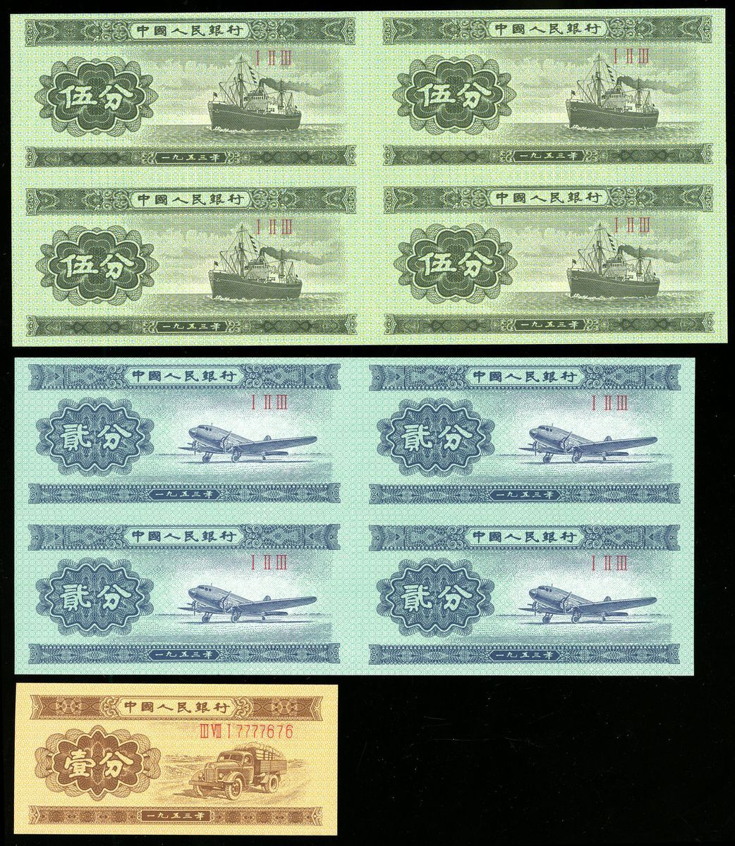 People's Bank of China, 2nd Series Renminbi, 2x uncut sheets of 4, 2 fen and 5 fen, 1953 3 Roman numerals; also 1x 1 fen, 1953, serial number III VIII I 7777676,