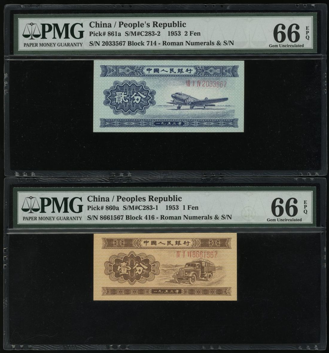 People's Bank of China, 2nd Series Renminbi, 1 fen and 2 fen , 1953, serial numbers IV I VI 8661567 and VII I IV 2033567,