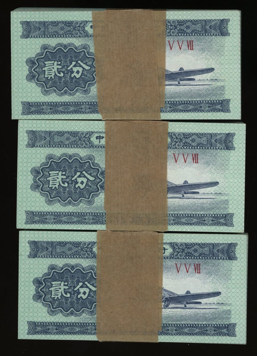 People's Bank of China, 2nd Series Renminbi, 3 bundles of 2 fen (300), prefix V V VII, (Pick 862b), generally uncirculated (300)