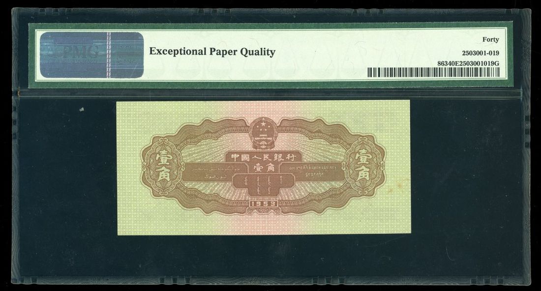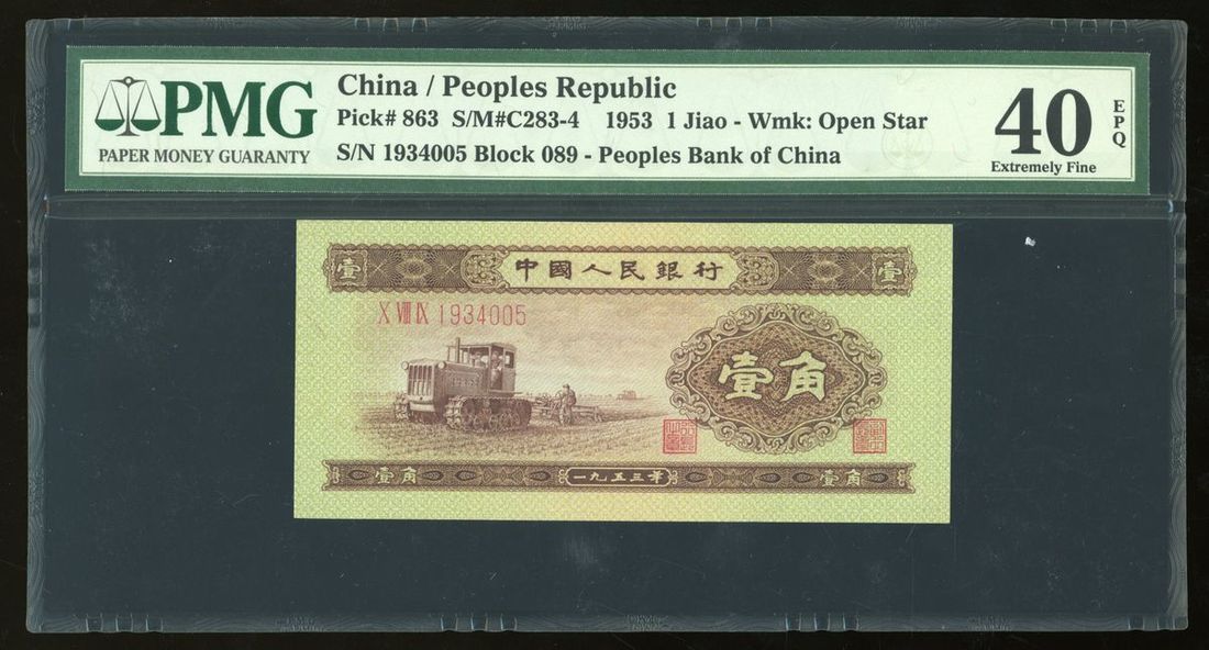 People's Bank of China, 2nd Series Renminbi, 1953, 1 Jiao, serial number X VIII IX 1934005, (Pick 863), PMG 40EPQ