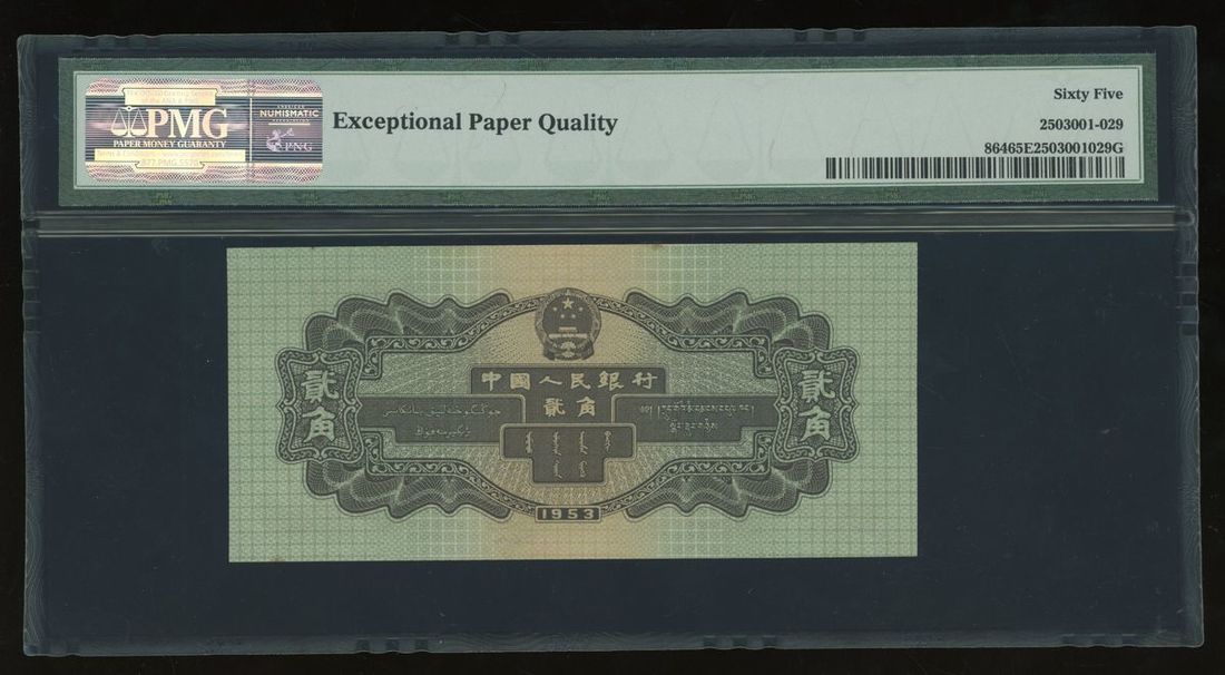 1953年中國人民銀行第二版貳角,編號VII IX I 9811117, PMG 65EPQ
