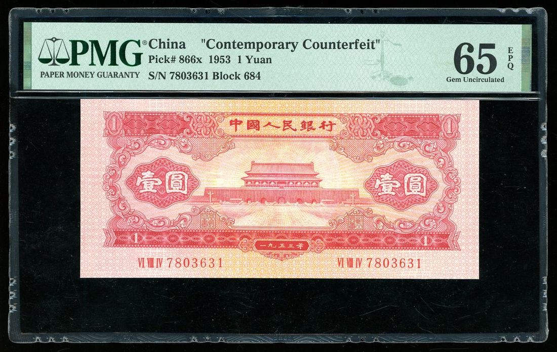 People's Bank of China, CONTEMPORARY COUNTERFEIT, 1953, 1 yuan, serial number VI VIII IV 7803631, (Pick 866x), PMG 65EPQ