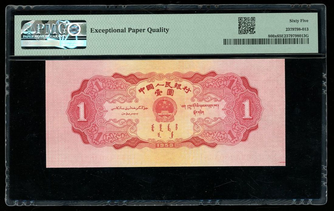 1953年中國人民銀行第二版壹圓,老假票,編號VI VIII IV 7803631,PMG 65EPQ