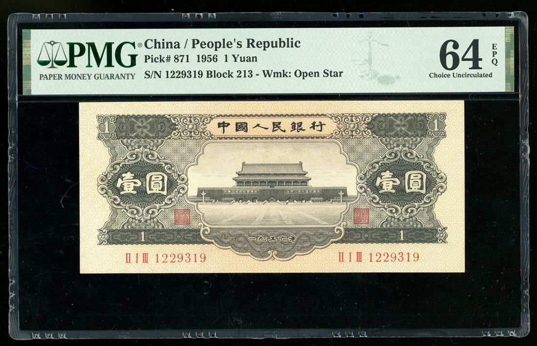 People's Bank of China, 2nd Series Renminbi, 1 Yuan, 1956, serial number II I III 1229319, (Pick 871) PMG 64EPQ