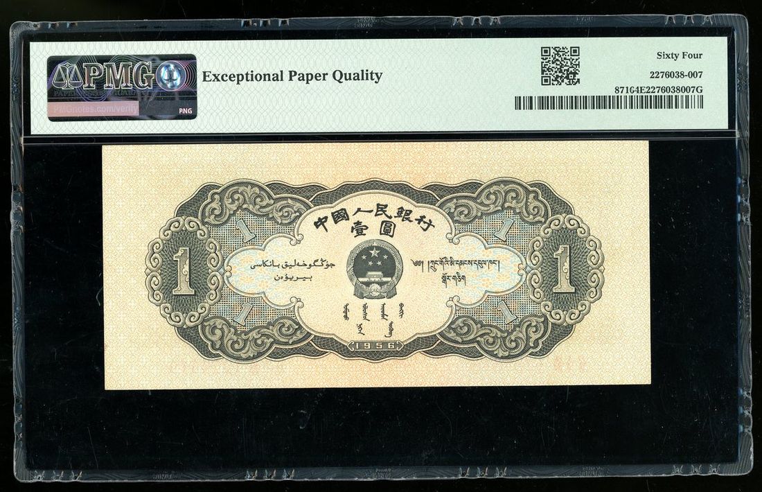 1956年中國人民銀行第二版壹圓,編號II I III 1229319,PMG 64EPQ