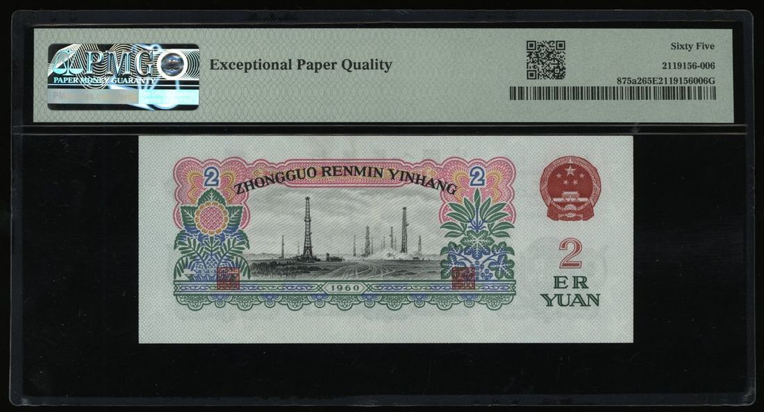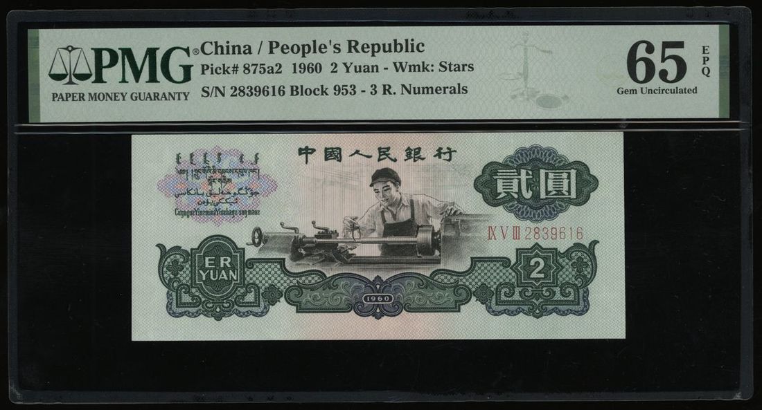 1960年中國人民銀行第三版貳圓,編號 IX V III 2839616,PMG 65EPQ