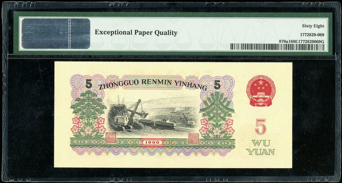 People's Bank of China, 3rd Series Renminbi, 1960, 5 yuan, serial number X VI VII 3100369, dark black, (Pick 876a1), PMG 68EPQ Gem Uncirculated