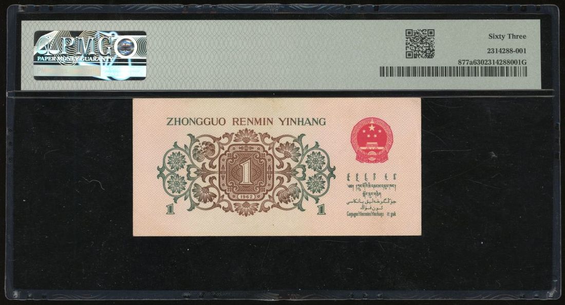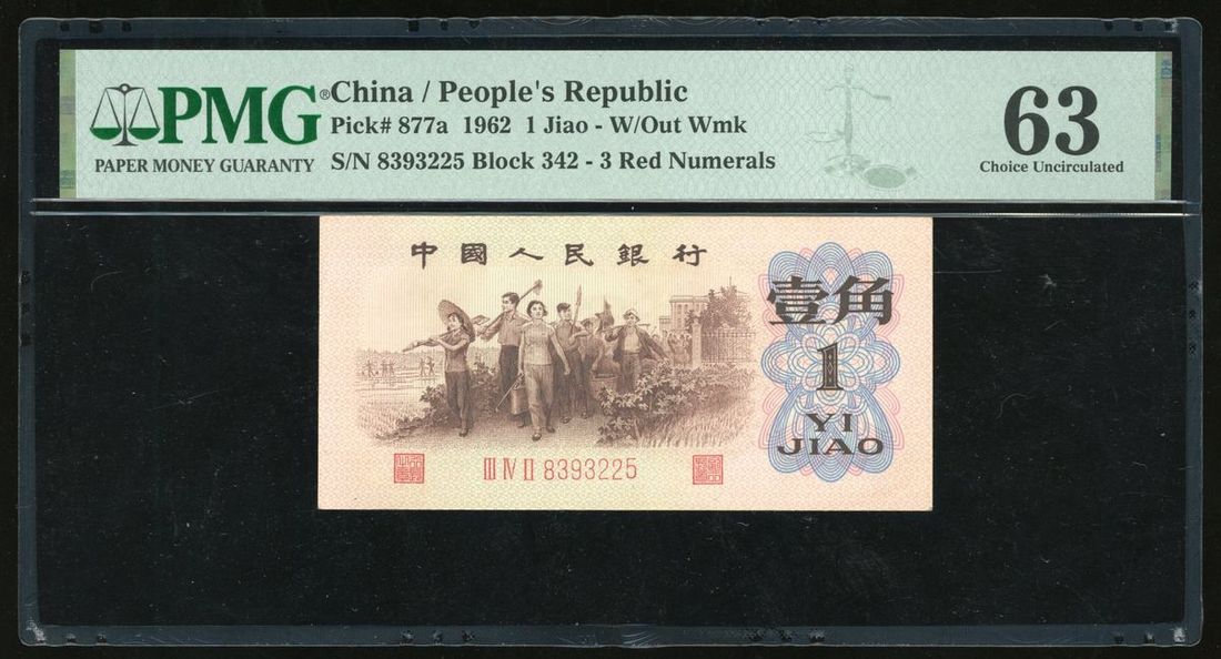 1962年中國人民銀行第三版壹角,編號 III IV II 8393225,PMG 63