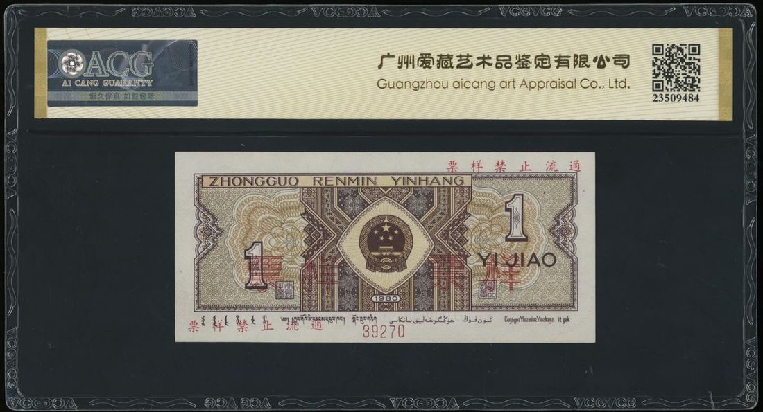 1980年中國人民銀行第四版壹角樣票,編號 JY 00000000,控號 39270,AU,有針孔