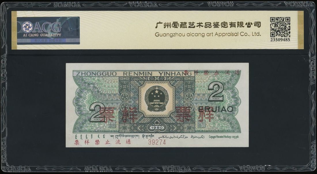 People's Bank of China, 4th Series Renminbi, 2 jiao specimen, 1980, serial number JY 00000000, control number 39274,
