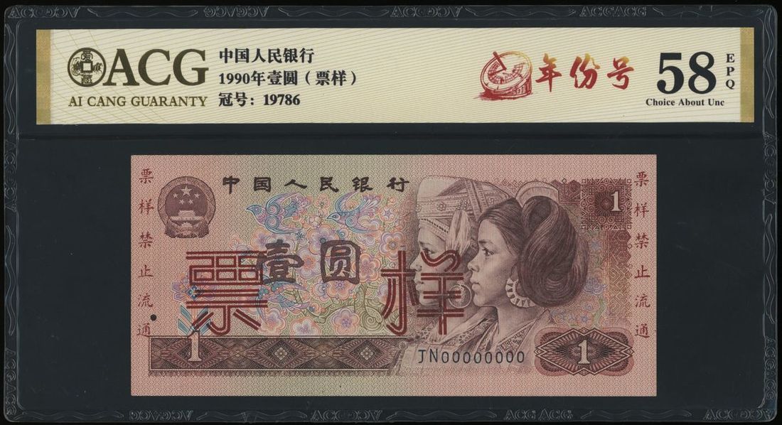 1980年中國人民銀行第四版壹圓樣票,編號 JY 00000000,控號 19786,AU,有針孔