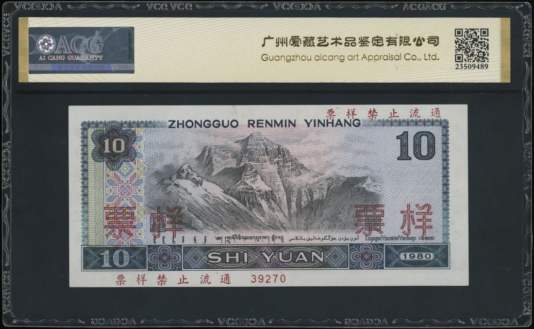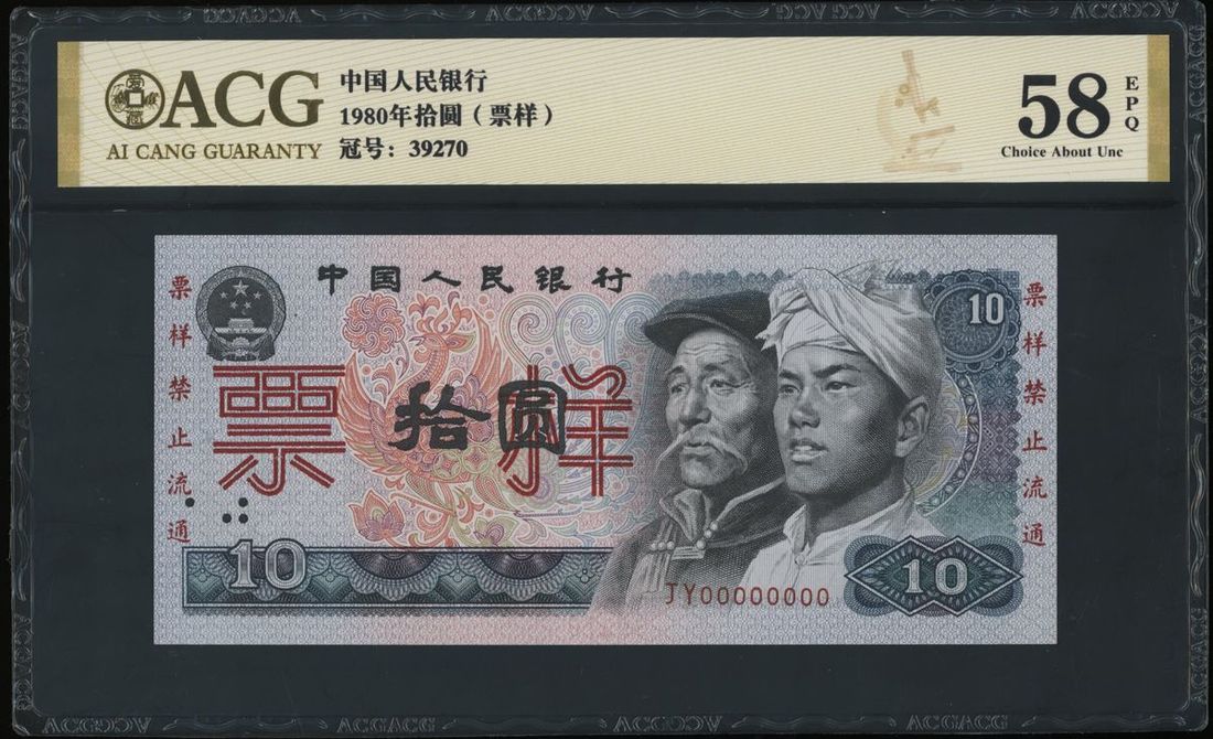 1980年中國人民銀行第四版拾圓樣票,編號 JY 00000000,控號 39270,AU,有針孔