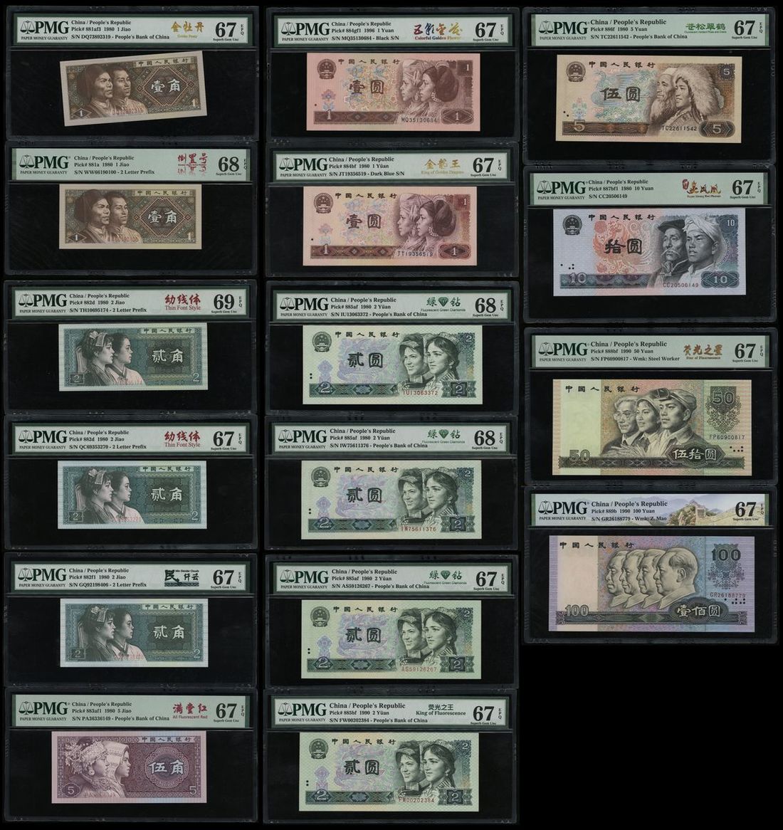 People's Bank of China, 4th Series Renminbi, a group of 16x, including: 2x 1 jiao, 3x 2 jiao, 5 jiao, 2x 1 yuan, 4x 2 yuan, 5 yuan, 10 yuan, 50 yuan and 100 yuan, 50 and 100 yuan issued in 1990,