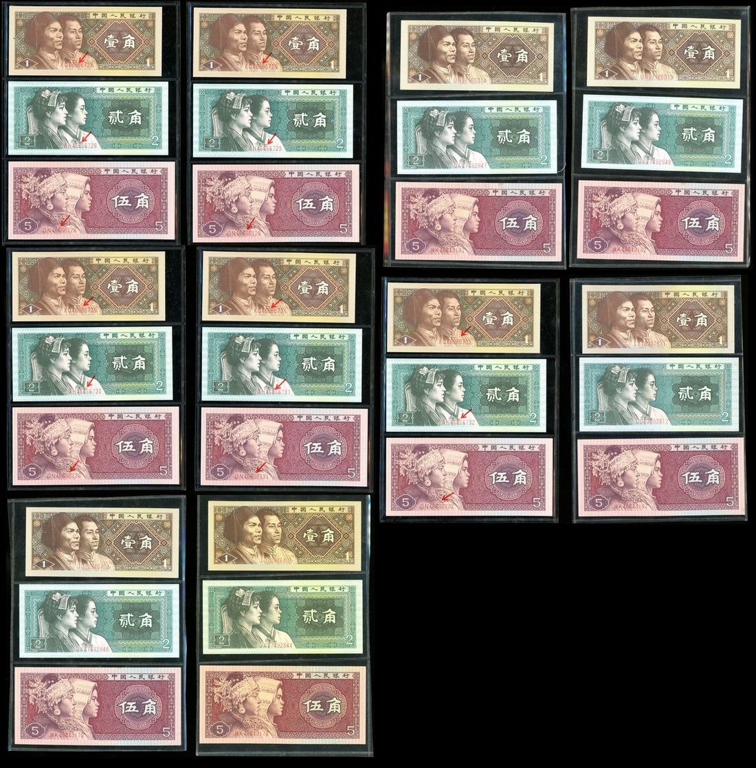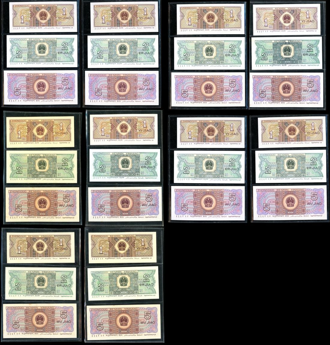 People's Bank of China, 4th Series Renminbi, 10x set of 3, including: 1 jiao, 2 jiao and 5 jiao, 1980, 5x sets have matching serial numbers 46666728-32,