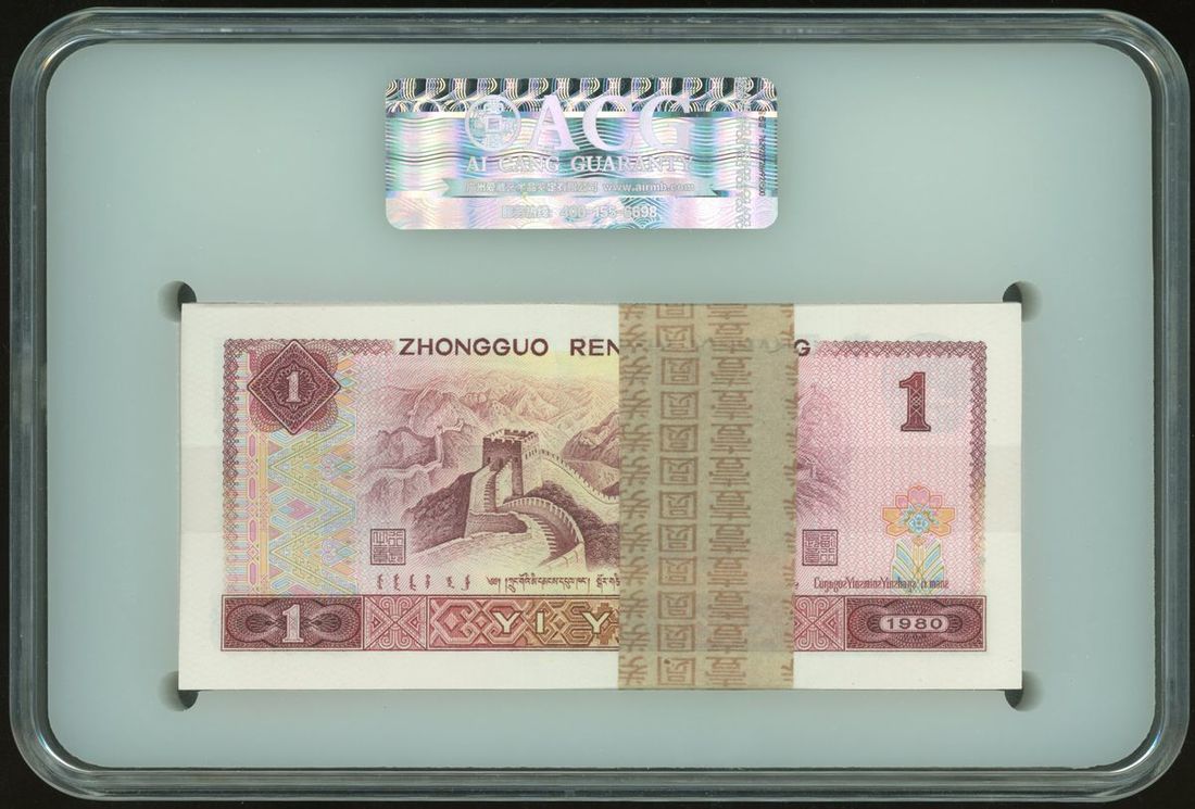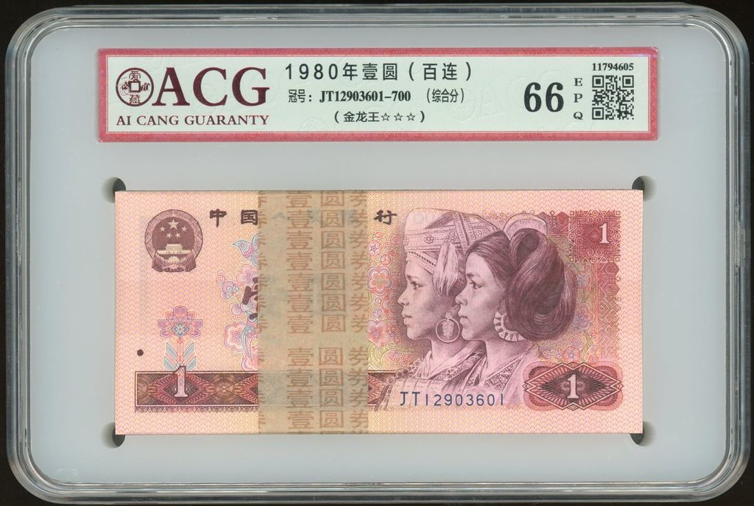 1980年中國人民銀行第四版壹圓連號一組100枚,編號JT 12903601-700,ACG 66EPQ