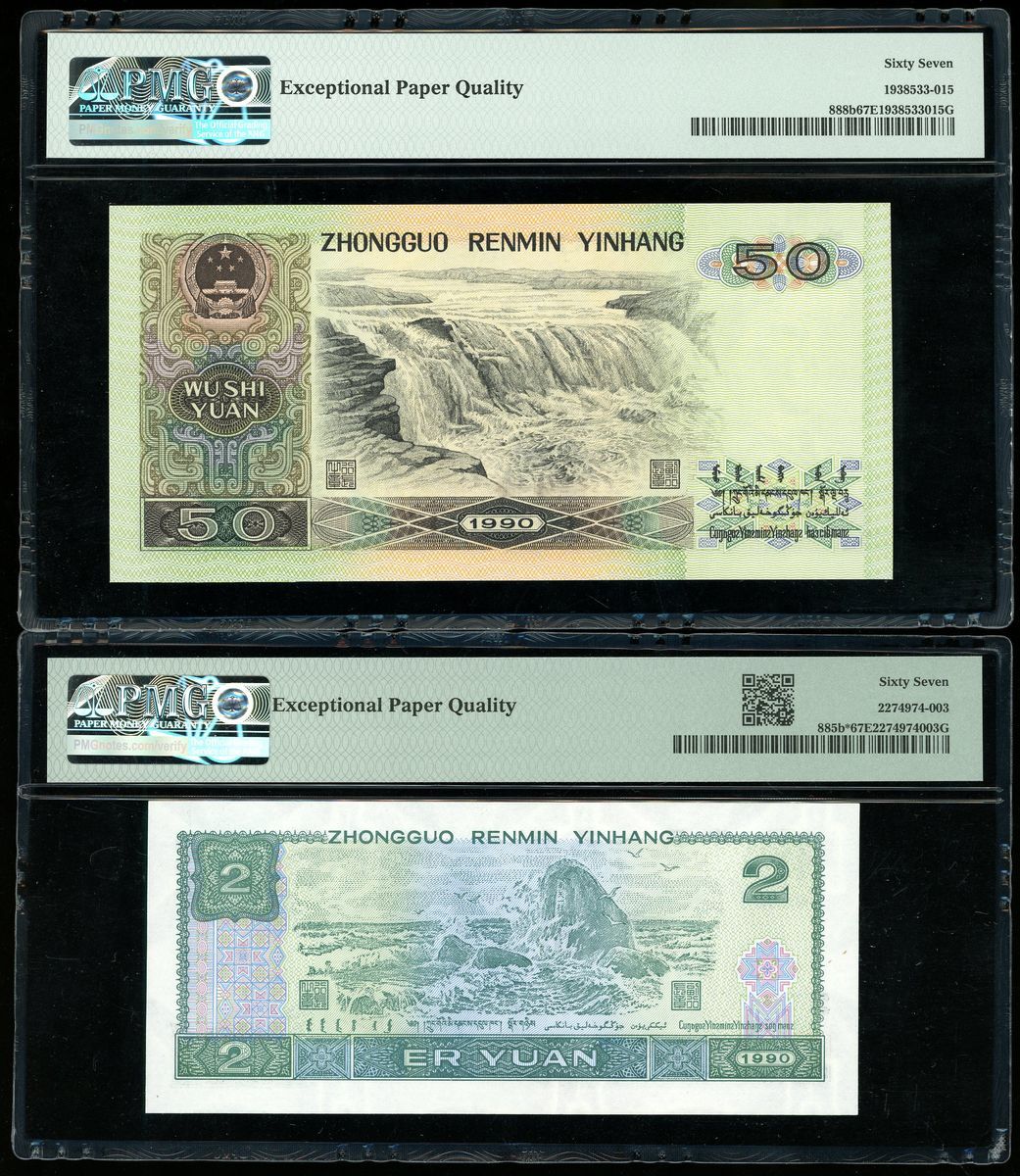 People's Bank of China, 4th Series Renminbi, 50 yuan and replacement 2 yuan, 1990, serial numbers BP 02218316 and ZJ 13507333,