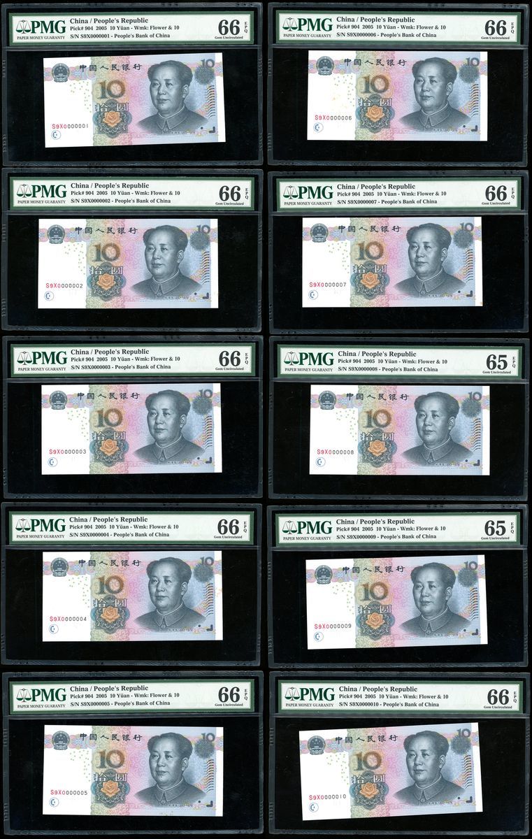 People's Bank of China, 5th Series Renminbi, 2005, consecutive 10 yuan (10), serial number S9X0000001-10, (Pick 904), PMG 65-66EPQ. Note foxing on some notes not mentioned by PMG (10)