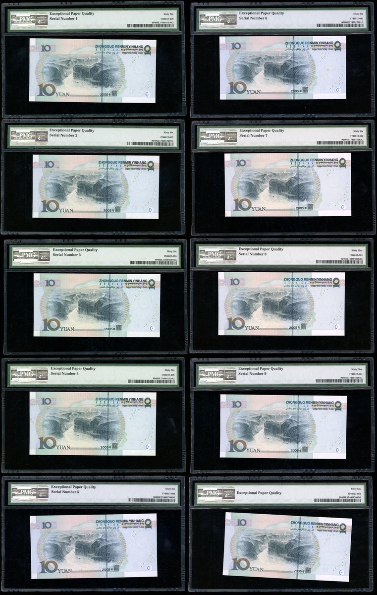 2005年中國人民銀行第五版拾圓連號一組10枚,編號S9X0000001-10,PMG 65-66EPQ,部分紙幣有泛黃氧化,PMG並未標註