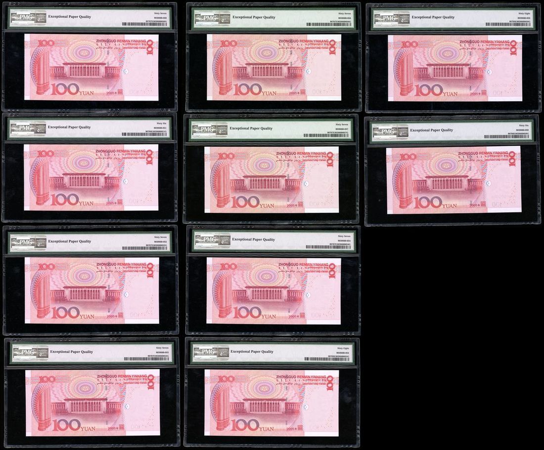 2005年中國人民銀行第五版壹佰圓連號一組10枚,編號 K06Y000001-10,除最後一張評級為PMG 66EPQ,其餘均為PMG 67-68EPQ