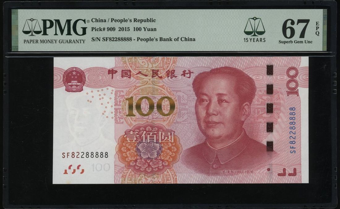 People's Bank of China, 5th Series Renminbi, 2015, 100 yuan, serial number SF82288888, (Pick 909), PMG 67EPQ
