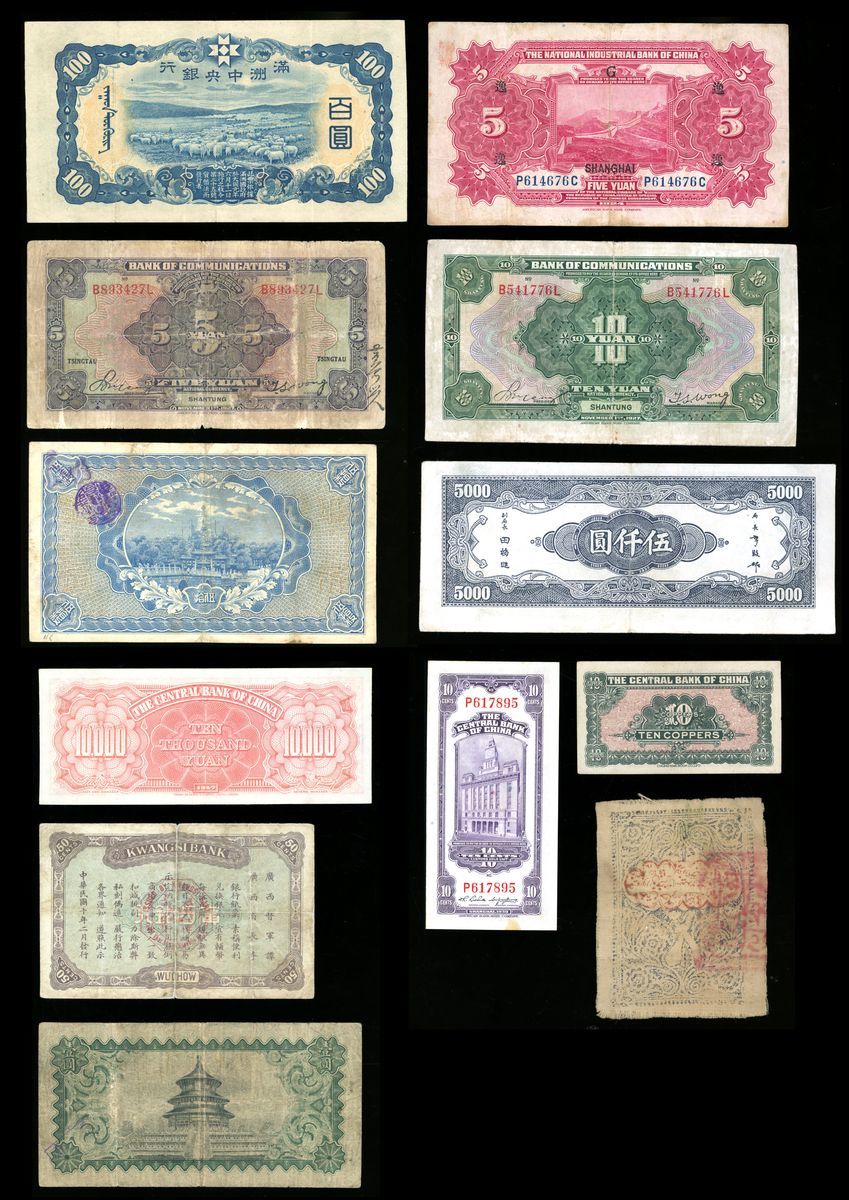 China, a group of 12x, including Central Bank of China (4), Bank of Communications 5 and 10 yuan Shantung issue, National Industrial Bank of China 5 yuan 1931, Market Stabilization Currency Bureau 50 copper 1915, United Islamic Republic of East Turkestan 100 silver dachin 1933, Provincial Bank of Manchuria 1 yuan 1922, Kwangsi Bank 5 jiao 1921 Wuchow issue, Central Bank of Manchou 100 yuan ND (1935-38),