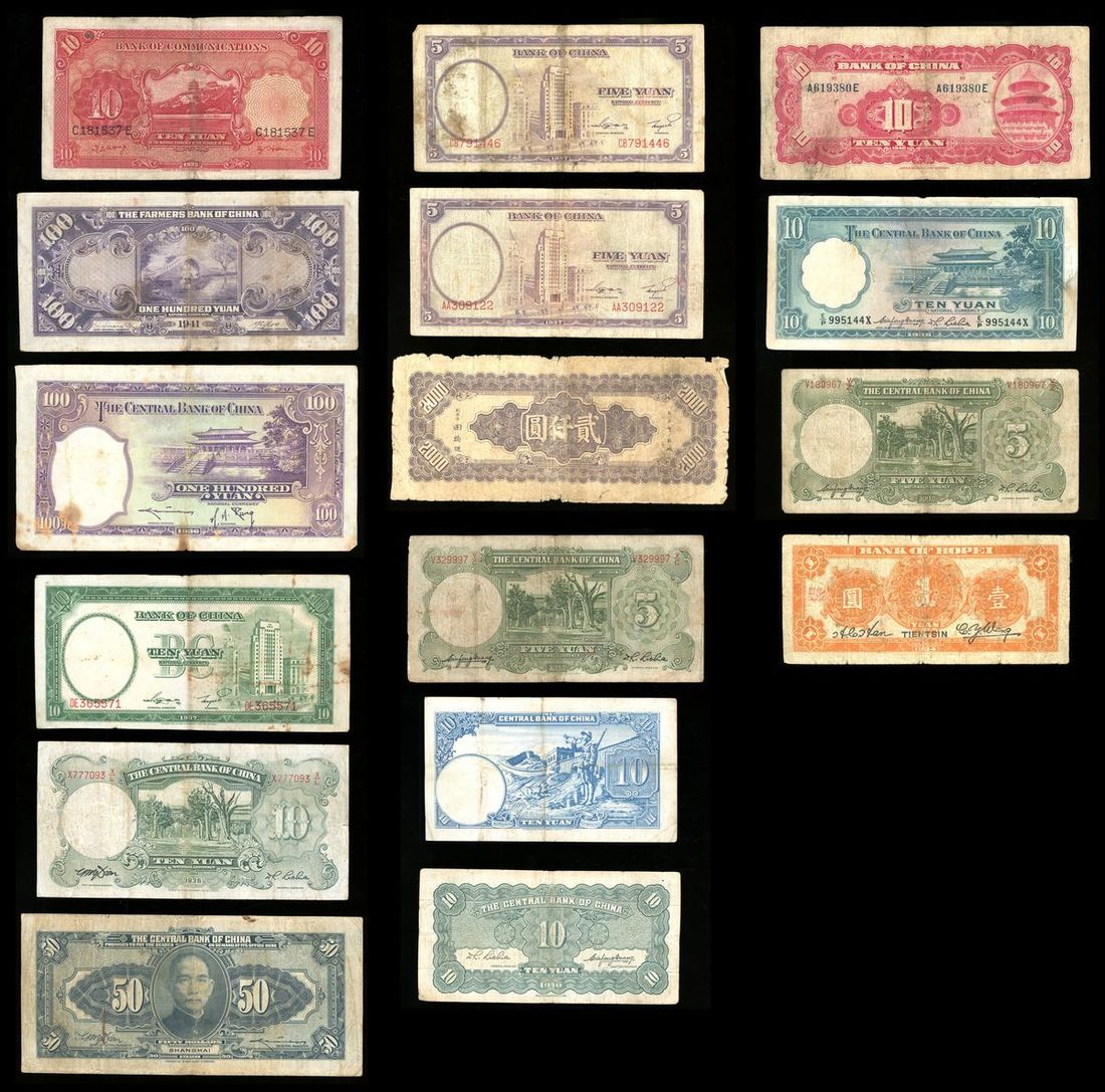China Banknotes a group of 16x, including Bank of China (4), Central Bank of China (9), Bank of Communications (1), Farmers Bank of China (1), Bank of Hopei (1),