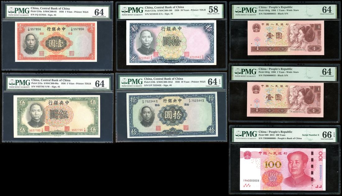 China, a group of 7 notes consisting of Central Bank of China 1, 5 and 2x10 yuan, 1936, serial number I/Q557856, V637785Y/W, E/P752344X, X210543Z/A and People's Bank of China 2x 1 yuan and 100 yuan, serial number TK86000033, TK86000055 and solid serial number T9H0000008,