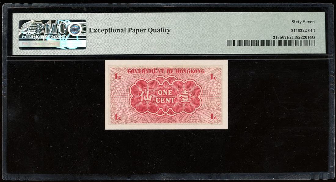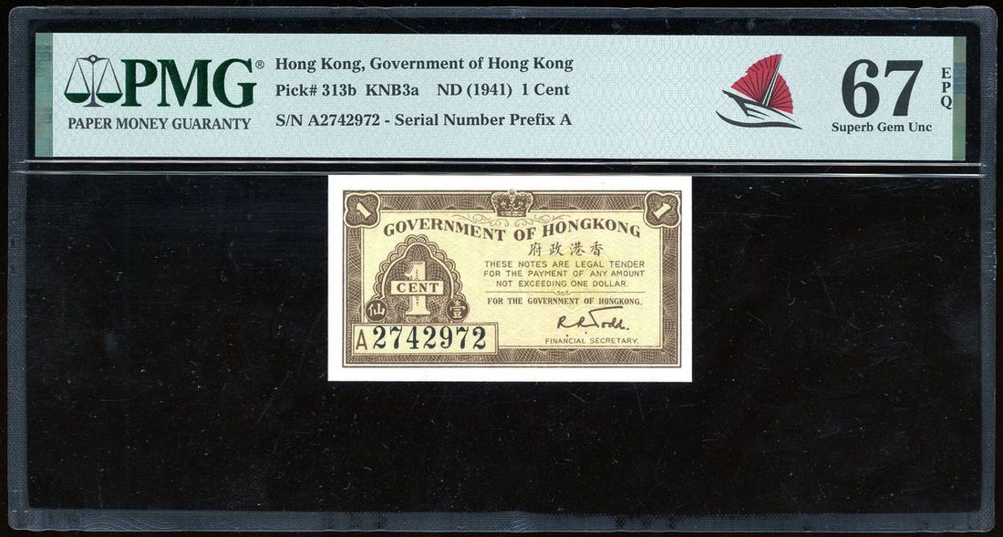 Government of HongKong, 1 cent, ND (1941), serial number A 2742972, (Pick 313b), PMG 67EPQ Superb Gem Uncirculated