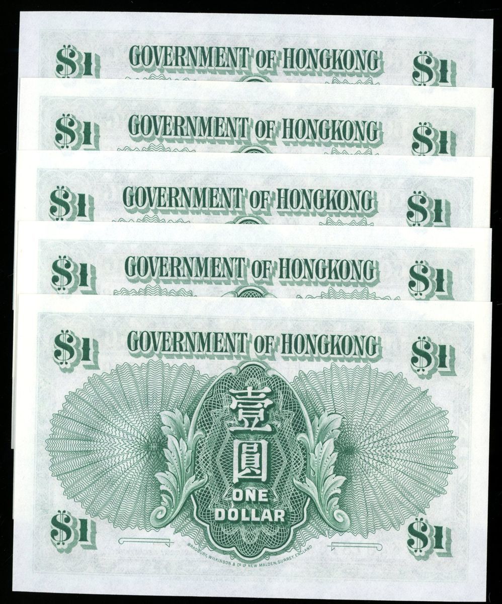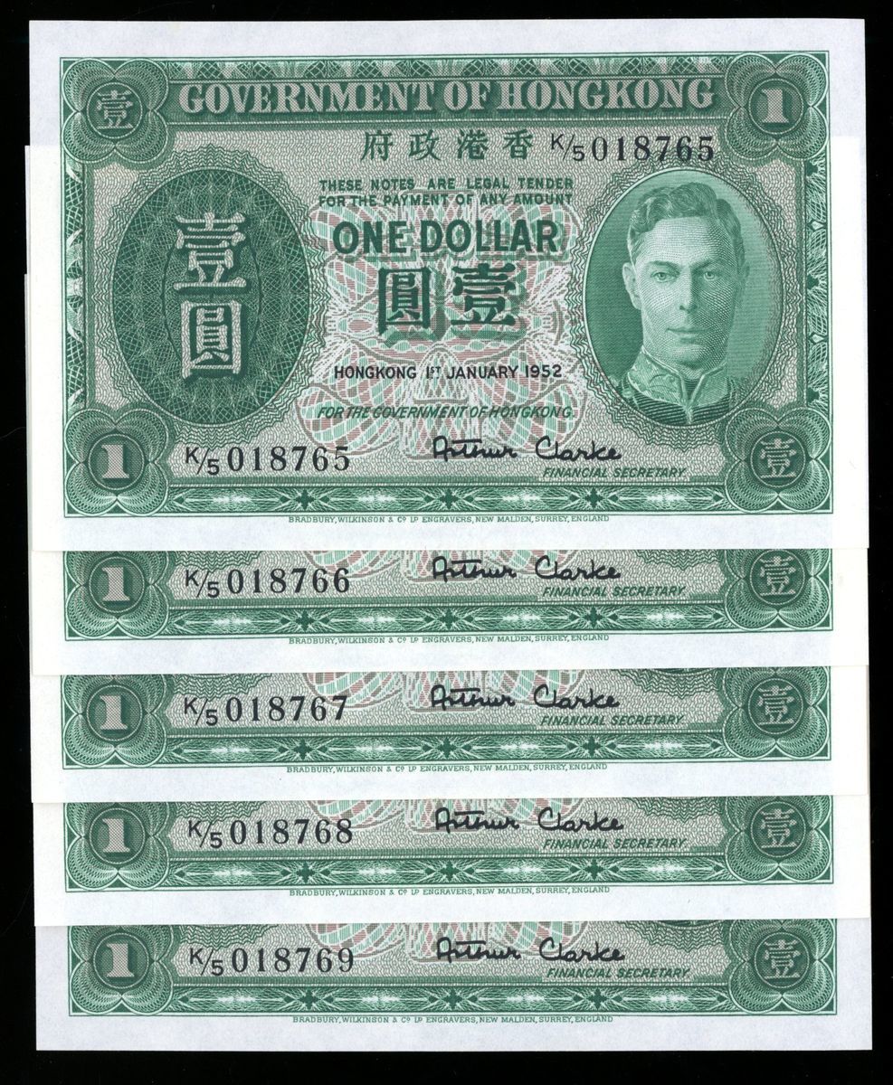 Government of HongKong, consecutive $1 (5), 1.1.1952, serial numbers K/5 018765/6/7/8/9, (Pick 324b), uncirculated (5)