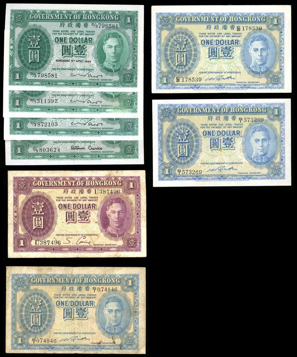 Government of HongKong, a group of George VI $1 issues, 1939 (1), 1940 (3), 1949 (3), 1952 (1), (Pick 312, 316, 324), various conditions (8)