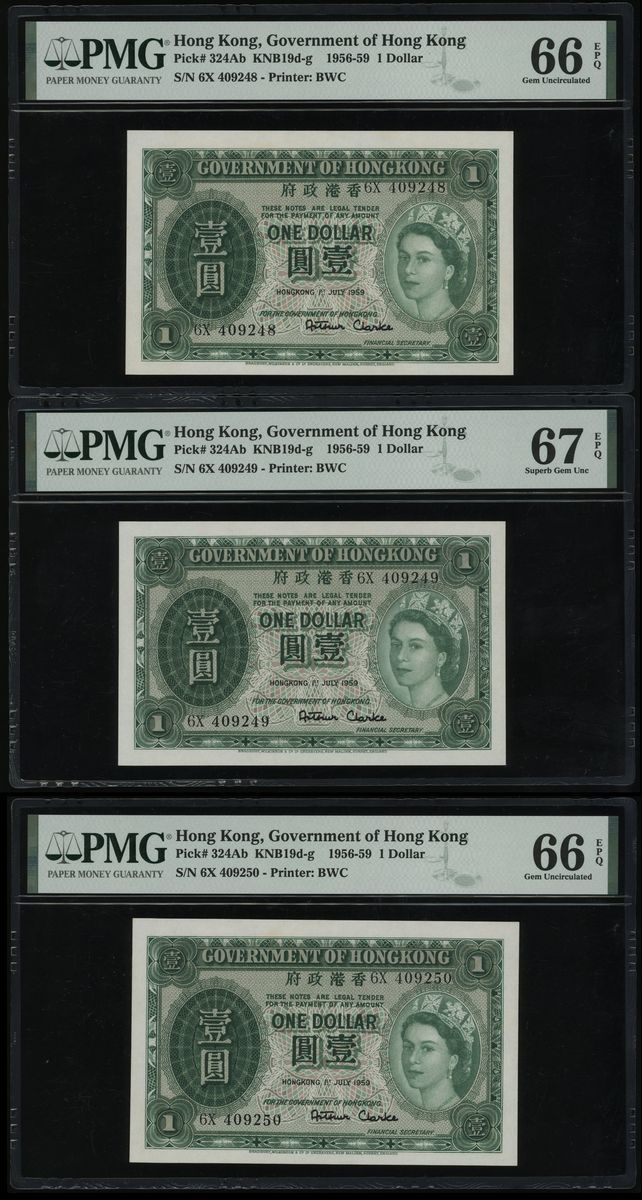 Government of HongKong, consecutive $1 (3), 1.7.1959, serial numbers 6X 409248/49/50, (Pick 324Ab), PMG 66-67EPQ (3)