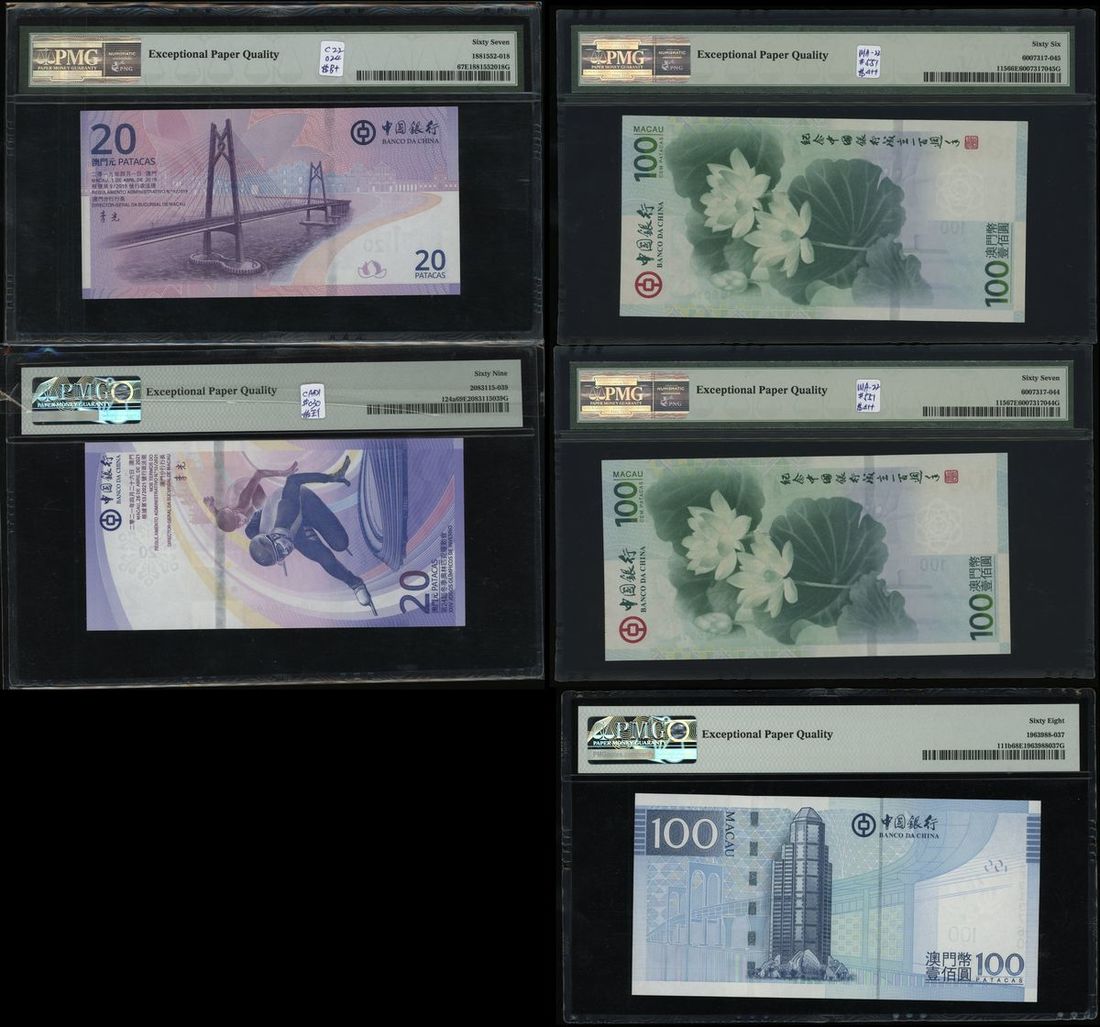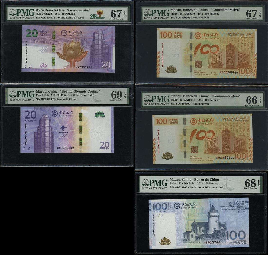 Banco da China, Macau, a group of 5x, including: 20 patacas, 2019, 20th Anniversary of Macau's Handover commemorative issue; 20 patacas, 2022, Beijing Winter Olympics commemorative issue; a consecutive pair of 100 patacas, 2012, 100th Anniversary of Banco da China commemorative issue; 100 patacas, 2013;