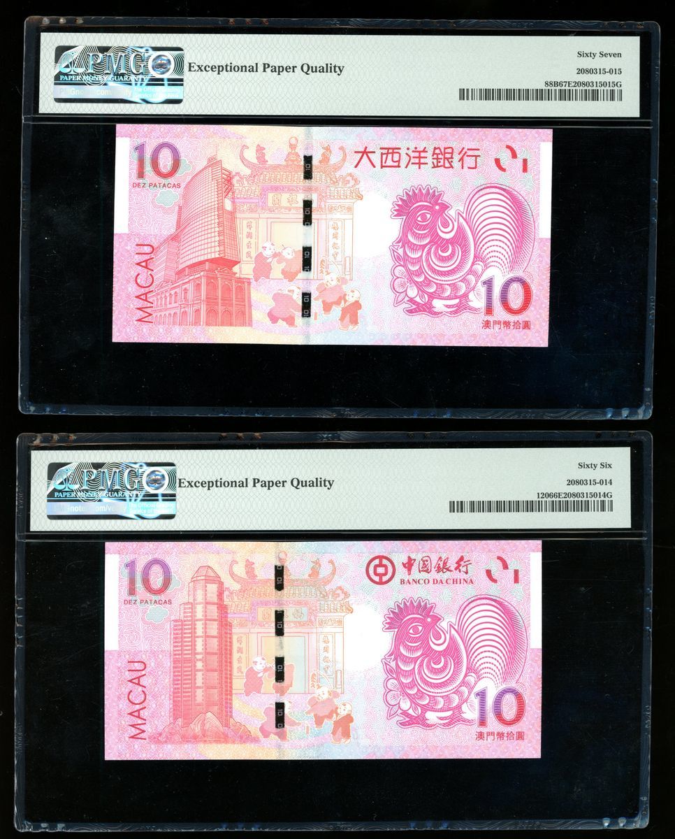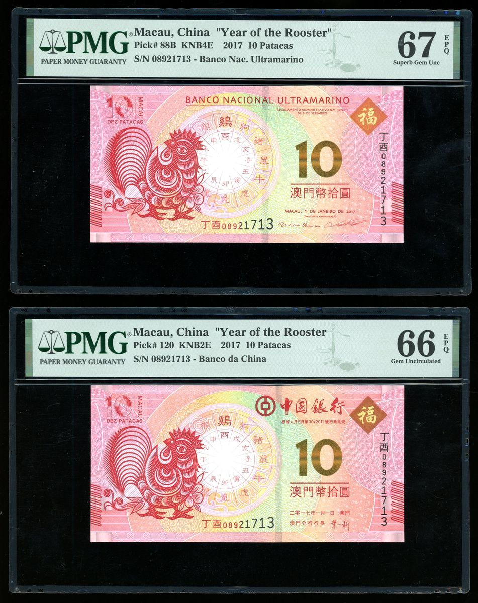 BNU/BoC, Macau, a pair of 10 patacas, 2017, Year of the Rooster commemorative issue, matching serial numbers 08921713,
