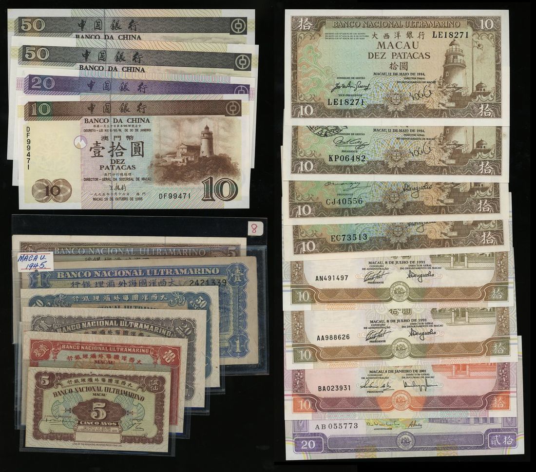 -Banco Nacional Ultramarino 5, 10, 20 and 50 avos, 1946; 1x 1 patacas, 1945; 1x 5 patacas, 1976; 7x 10 patacas, 1981-2001; 1x 20 patacas, 1996;