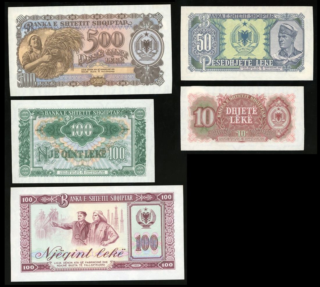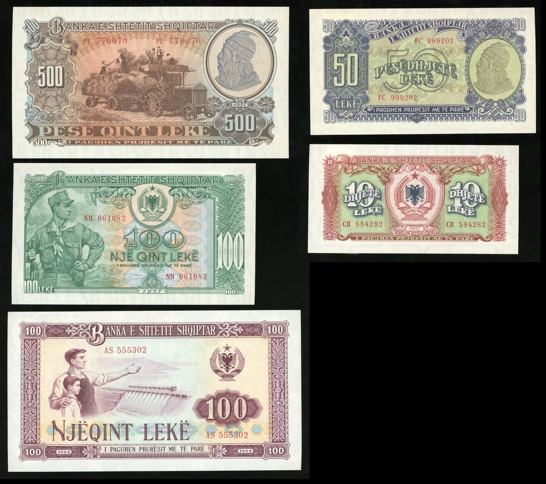 Banka e Shqipërisë, Albania, a group of 5x, including 1957 10, 50, 100 and 500 lekë, also 1964 100 lekë, (Pick 28, 29, 30, 31, 39), Uncirculated (5)