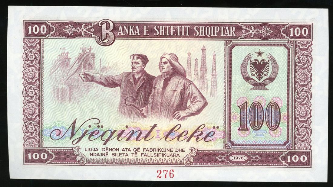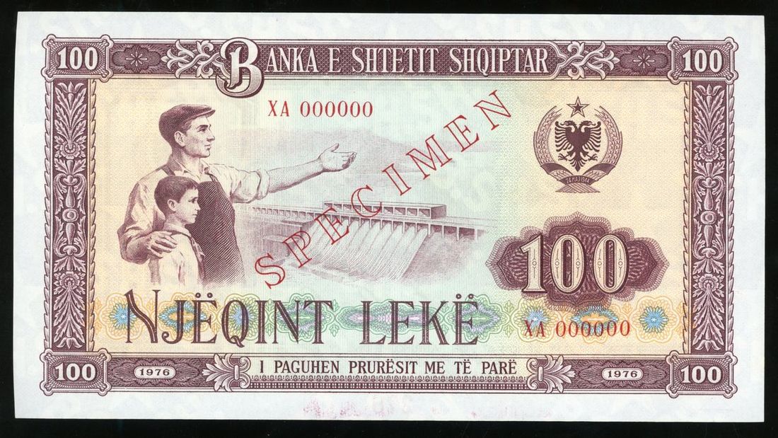 Banka e Shtetit Shqiptar, Albania, specimen 100 lekë, 1976, serial number XA 000000, control number 276,
